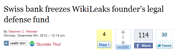 • A cyber-war over WikiLeaks appears to be escalating. Supporters of the site are reportedly taking revenge against the Swiss bank that froze Assange’s assets, and are now targetting PayPal.